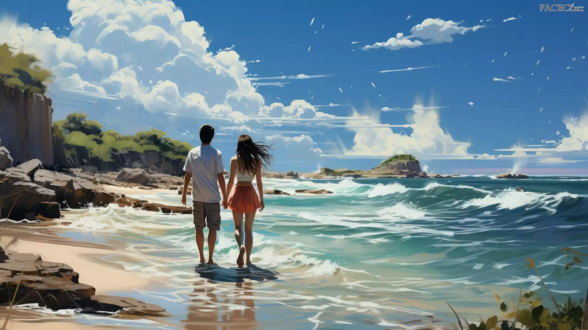 Para, Mężczyzna, Fale, Grafika, Lato, Skały, Plaża, Kobieta, Morze - faceci.biz